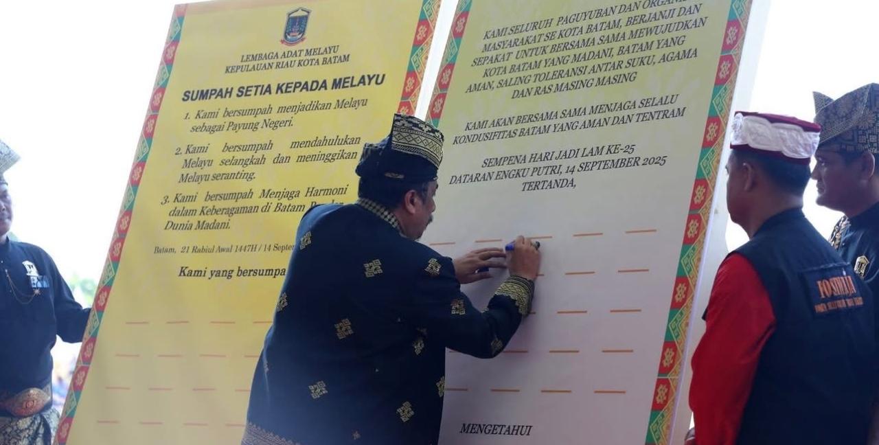 Ketua LAM Batam, YM Dato’ Wira Setia Utama Raja M Amin, mengawali penandatanganan kesepakatan setia terhadap nilai-nilai Melayu di sela peringatan Harlah ke-25 LAM Batam di Dataran Engku Puteri, Ahad (14/9).LAM Seperempat Abad, Harmoni Jadi Modal Utama Batam Redaksi Bermarwah.id September 14, 2025September 14, 2025