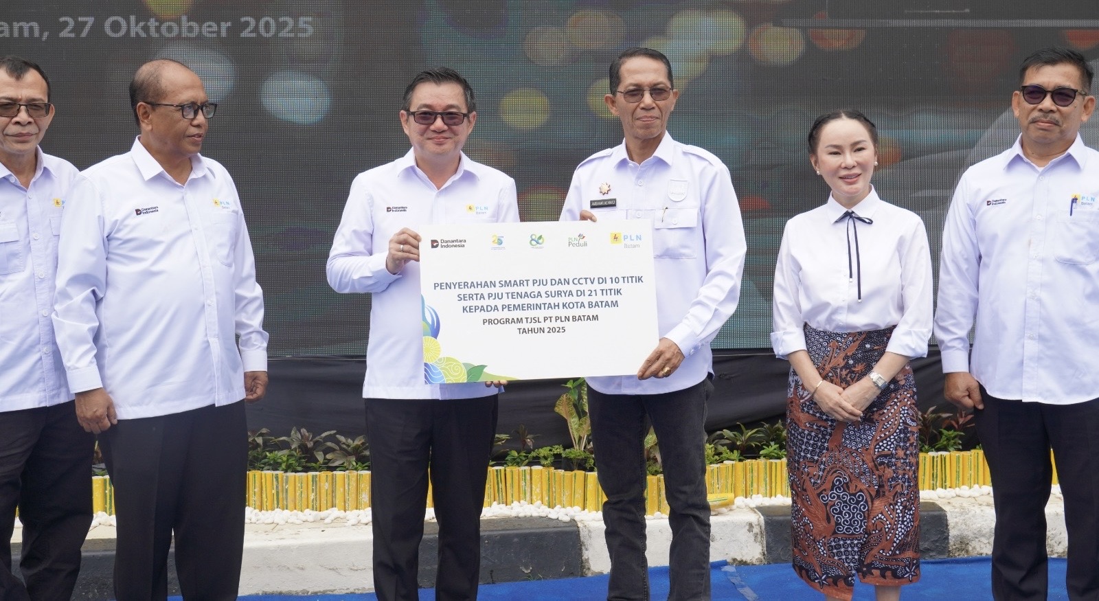 Wali Kota Batam bersama jajaran pimpinan PLN Batam pada kegiatan penyerahan fasilitas penerangan jalan dalam rangka peringatan Hari Listrik Nasional ke-80 di Kantor Korporat PLN Batam.