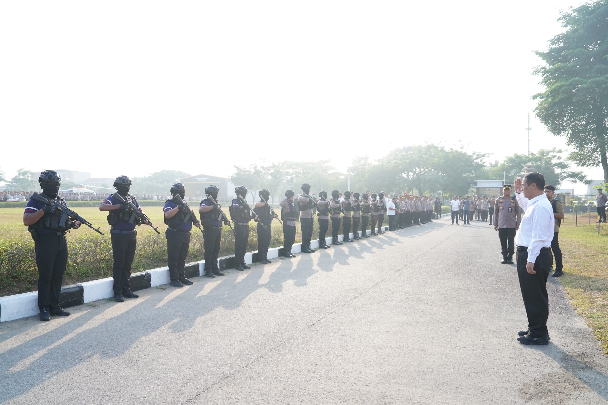 Menteri Pertanian RI Dr. Ir. H. Andi Amran Sulaiman beserta rombongan, disambut dengan jajar hormat oleh Tim RAGA Polda Riau, Rabu (23/7/2025).