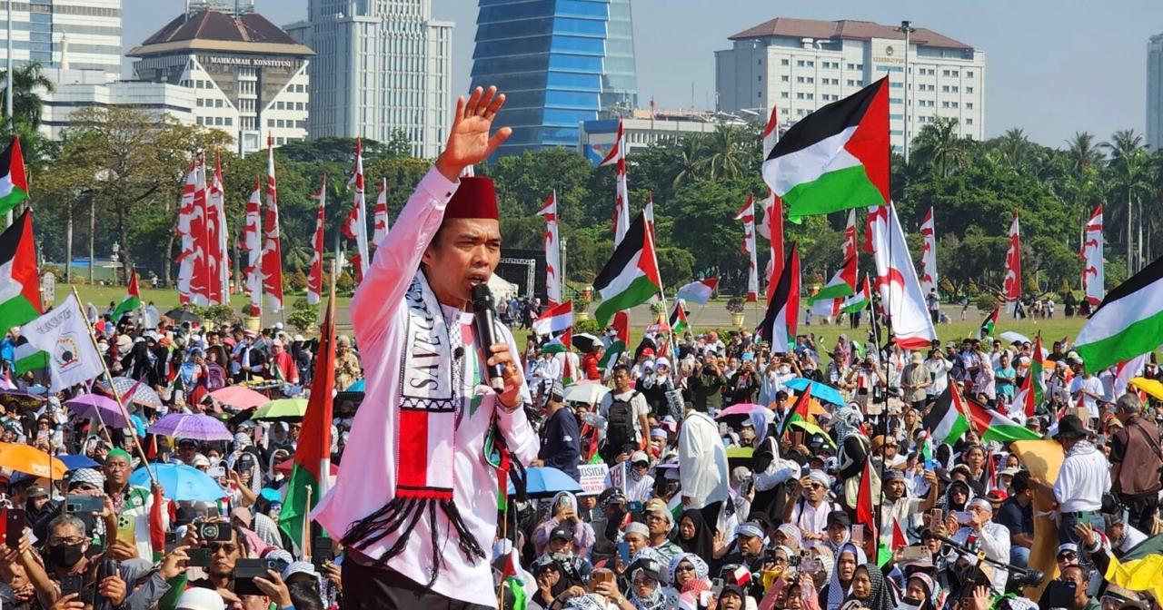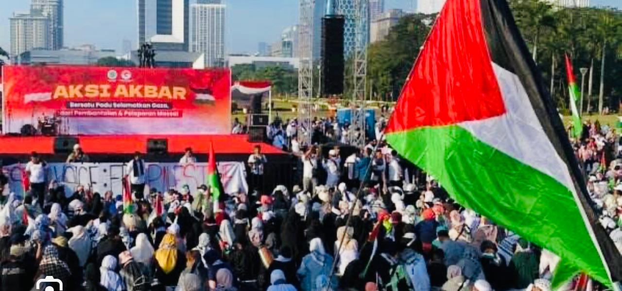 Aksi damai bela Palestina yang digelar di Monas, Jakarta, 3 Agustus 2025, berlangsung sejak pagi.